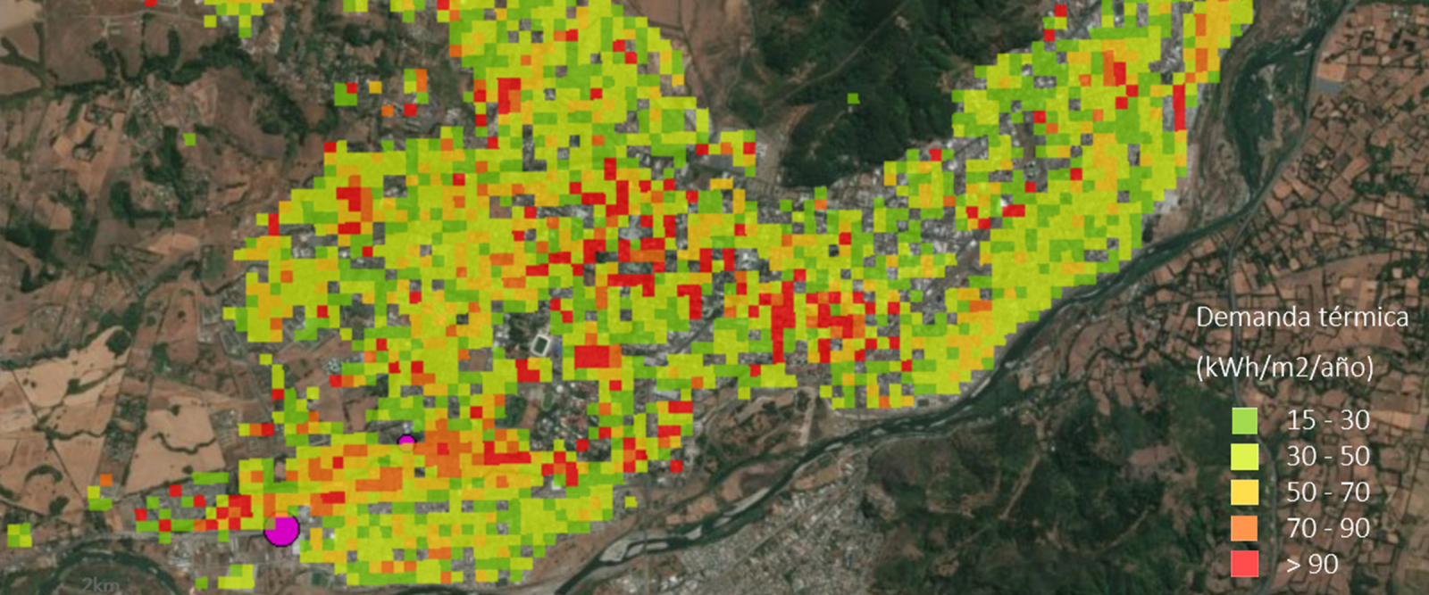 El proyecto consiste en el desarrollo de una metodología para la elaboración de Heat maps (o mapas de calor) adaptada a la realidad del país, junto con el desarrollo de 11 mapas de calor para distintas comunas, lo anterior, con el fin de actuar como una herramienta para el fomento de sistemas de energía distrital en Chile. Estos mapas contemplan la demanda y oferta de energía térmica en las distintas zonas, por lo que permiten identificar sinergias entre clústeres de alta demanda y lugares con oferta de energía térmica, facilitando la identificación de potenciales zonas con oportunidades de sistemas distritales.
